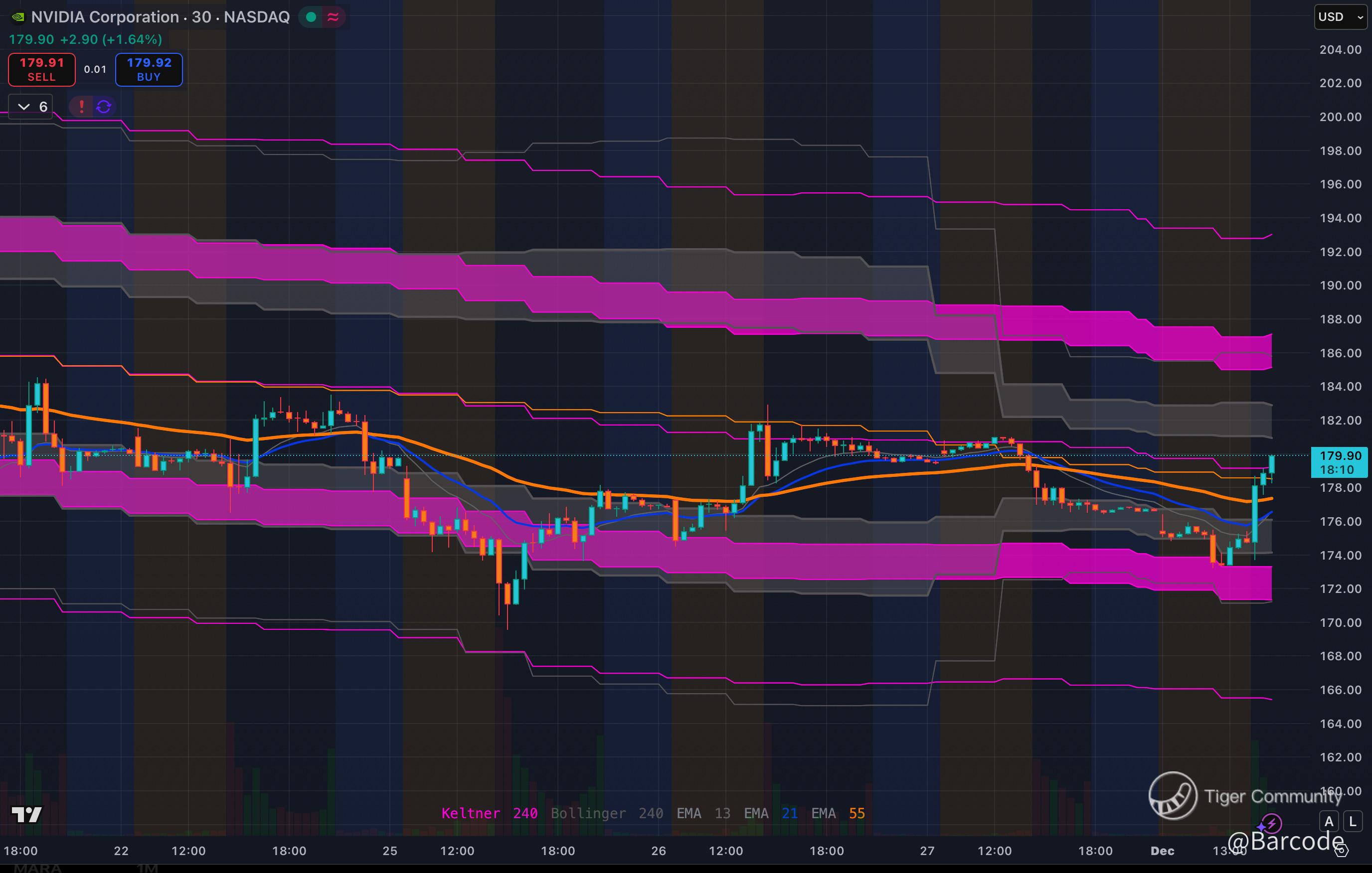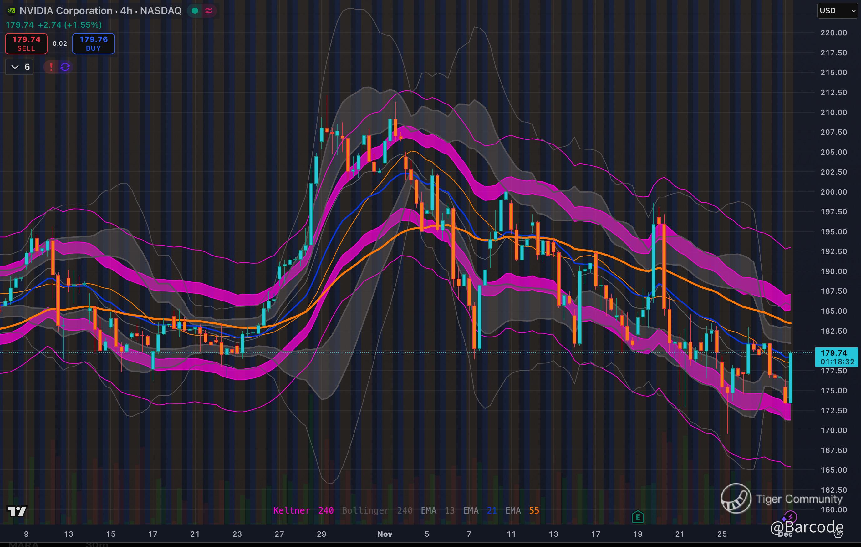 Short-term Outlook stays constructive while $NVDA holds above $175 with continuation into $187 once the Keltner 240 upper band clears. A break below $171 invalidates and reopens $166. Macro alignment remains positive with AI capex trending above $200bn annually, the volatility regime easing toward multi-decade lows, and the US extending CHIPS Act incentives for domestic fab capacity.