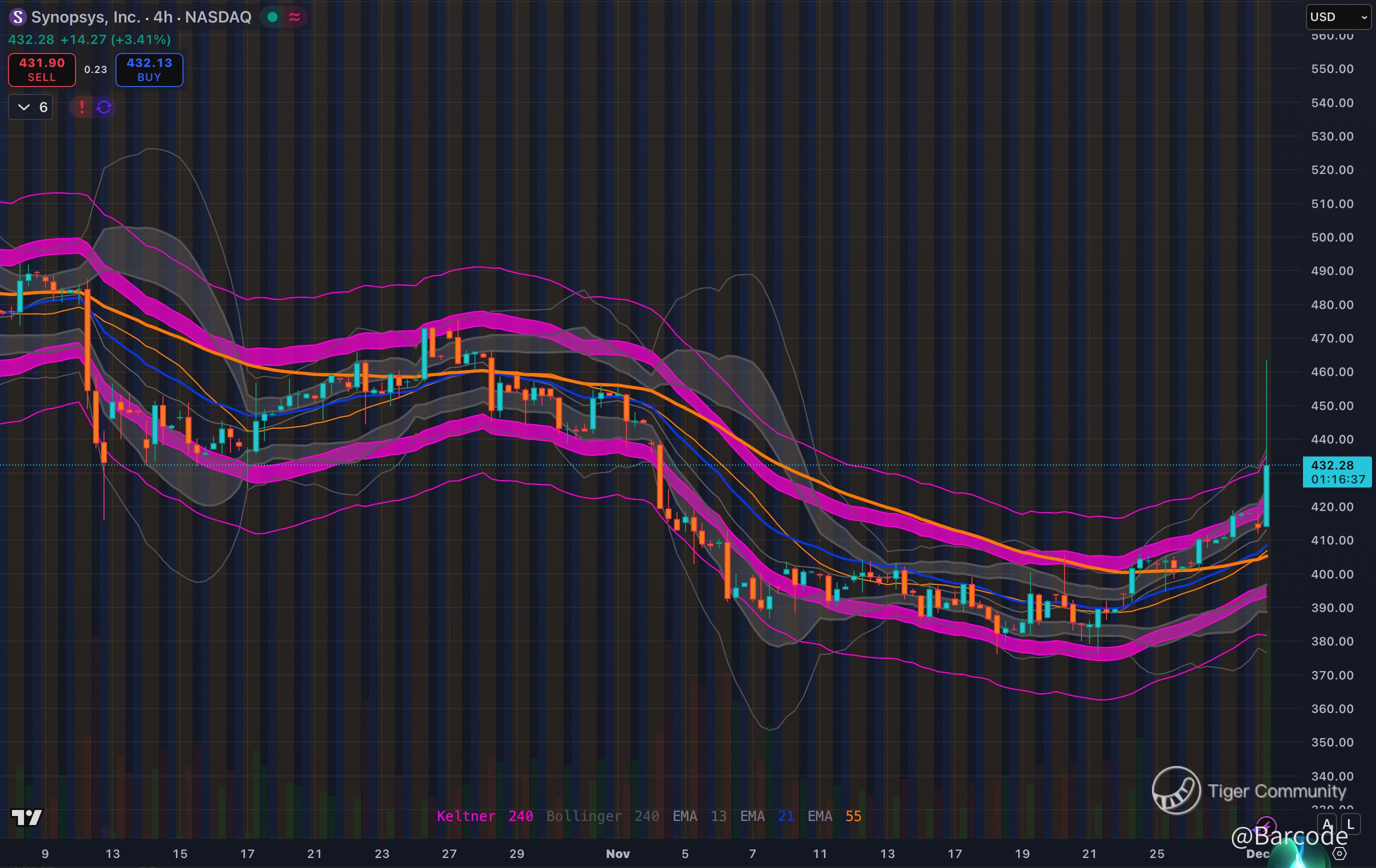 Short-term Outlook supports continuation toward $448 while $SNPS holds $420 with momentum supported by the Keltner 240 and EMA 55 confluence. Invalidation sits at $405. Sector macro trends remain bullish as global EDA spend approaches $20bn by 2026, US export controls channel demand toward aligned nodes, and the $NVDA partnership compresses simulation timelines from weeks to hours according to Ghaziβs comments. This positions $SNPS as a critical linchpin for physical AI verification across robotics, aerospace, and next-gen semiconductor pipelines.