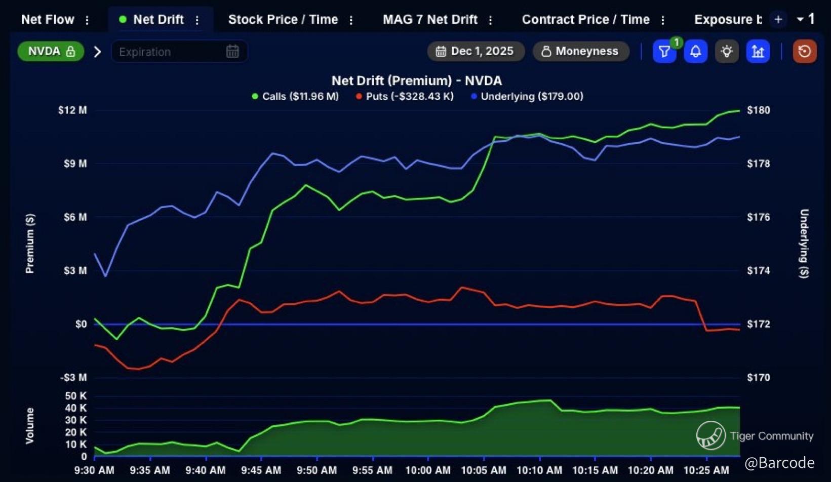 Immediate Market Read shows a decisive positioning shift with $11.91mn in single-leg calls routed through the tape as of 02Dec25 NZT, lifting the underlying more than 1.1% as net call drift overwhelms. Green call premium builds from $3mn to $11.96mn, puts sit at minus $328k, and price grinds from $172 to $179. Options flows lean toward the $180 to $190 calls for near-expiry as traders chase short-dated convexity while implied volatility cools and clusters below 50% across the surface.