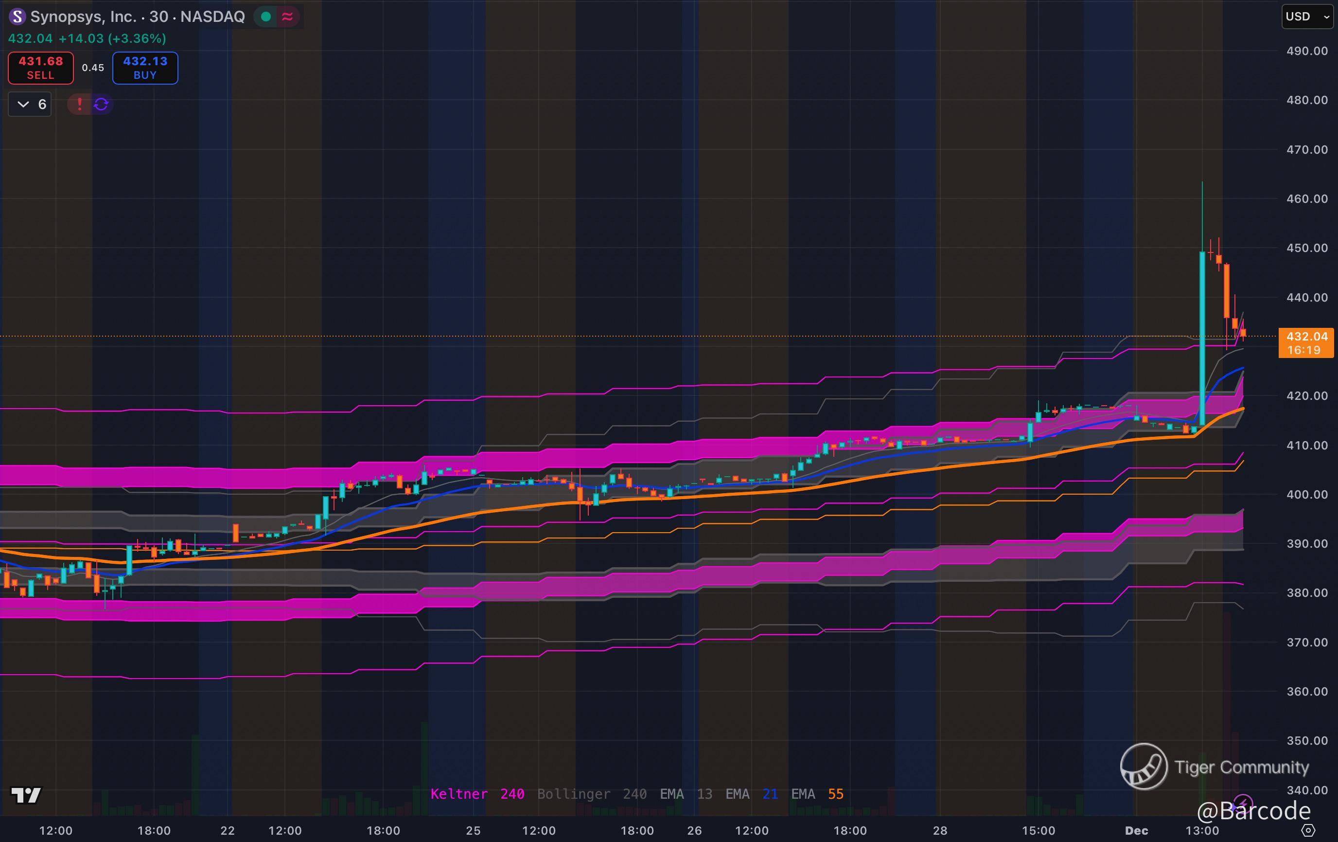 Immediate Market Read reflects $NVDAβs $2bn infusion making it the seventh-largest holder and driving a 10% intraday spike on 01Dec25 with more than 5mn shares traded, triple the average. $SNPS is holding the gap above $430 as AI-infused chip design becomes a revenue accelerator. Integration of CUDA compute, Omniverse digital twins, agentic AI stacks, and GPU workflows shifts $SNPS into expansion mode, with options flows building into the December $440 and $450 calls at premiums 15% above Fridayβs close.