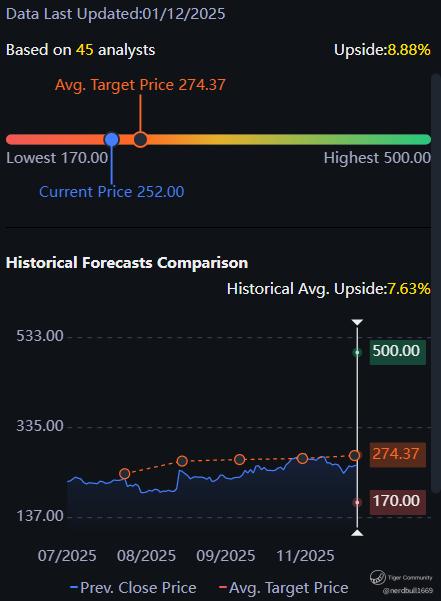 Based on 45 analysts from Tiger Brokers app offering 12 month price targets for Snowflake in the last 3 months. The average price target is $274.37 with a high forecast of $500.00 and a low forecast of $170.00. The average price target represents a 8.88% change from the last price of $252.00.