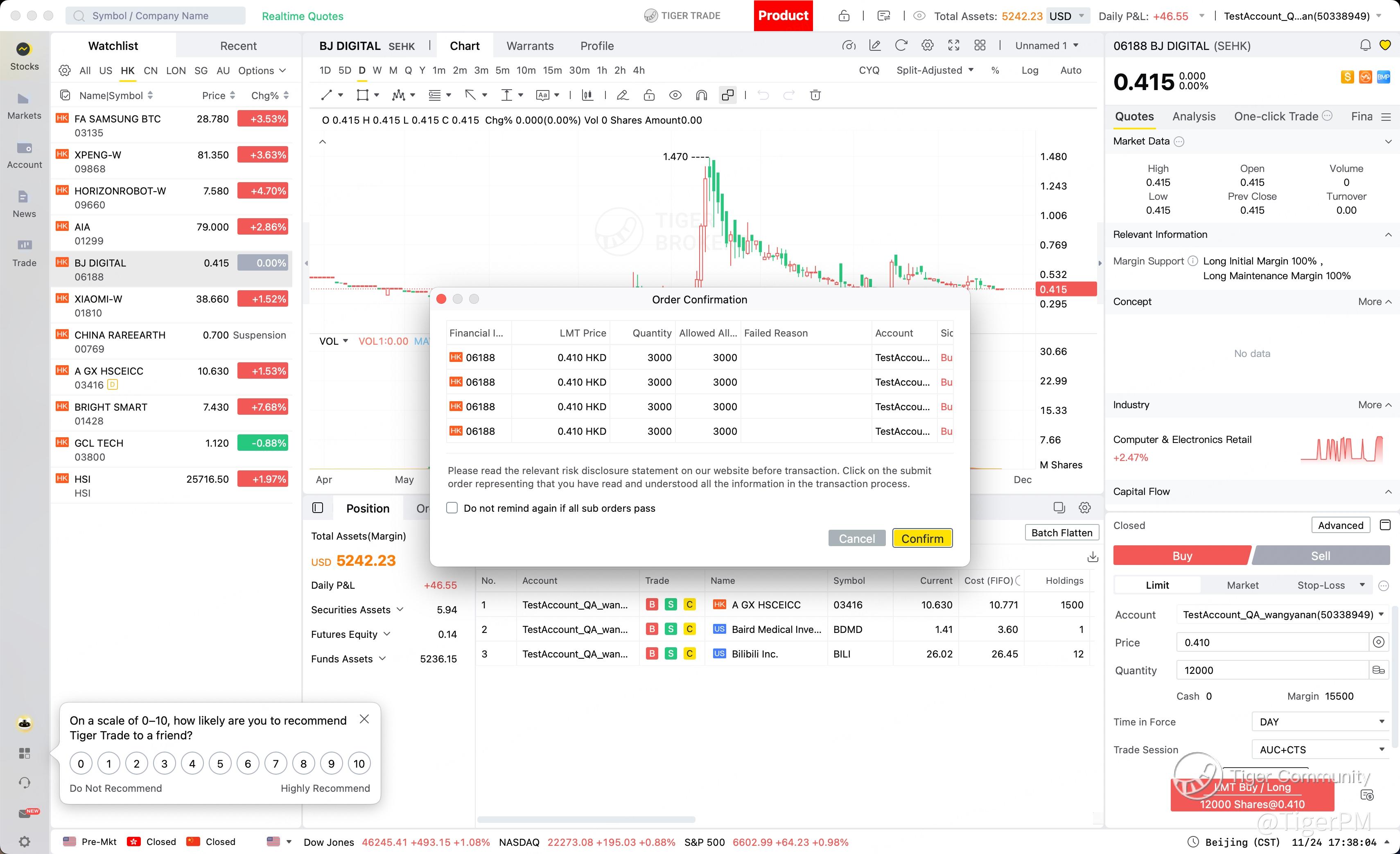 After setting the Order Split Quantity to 3000 in Settings - Trade - Quantity Settings - Order Split Settings, the order of 12,000 shares will be automatically split into four orders of 3000 shares each.