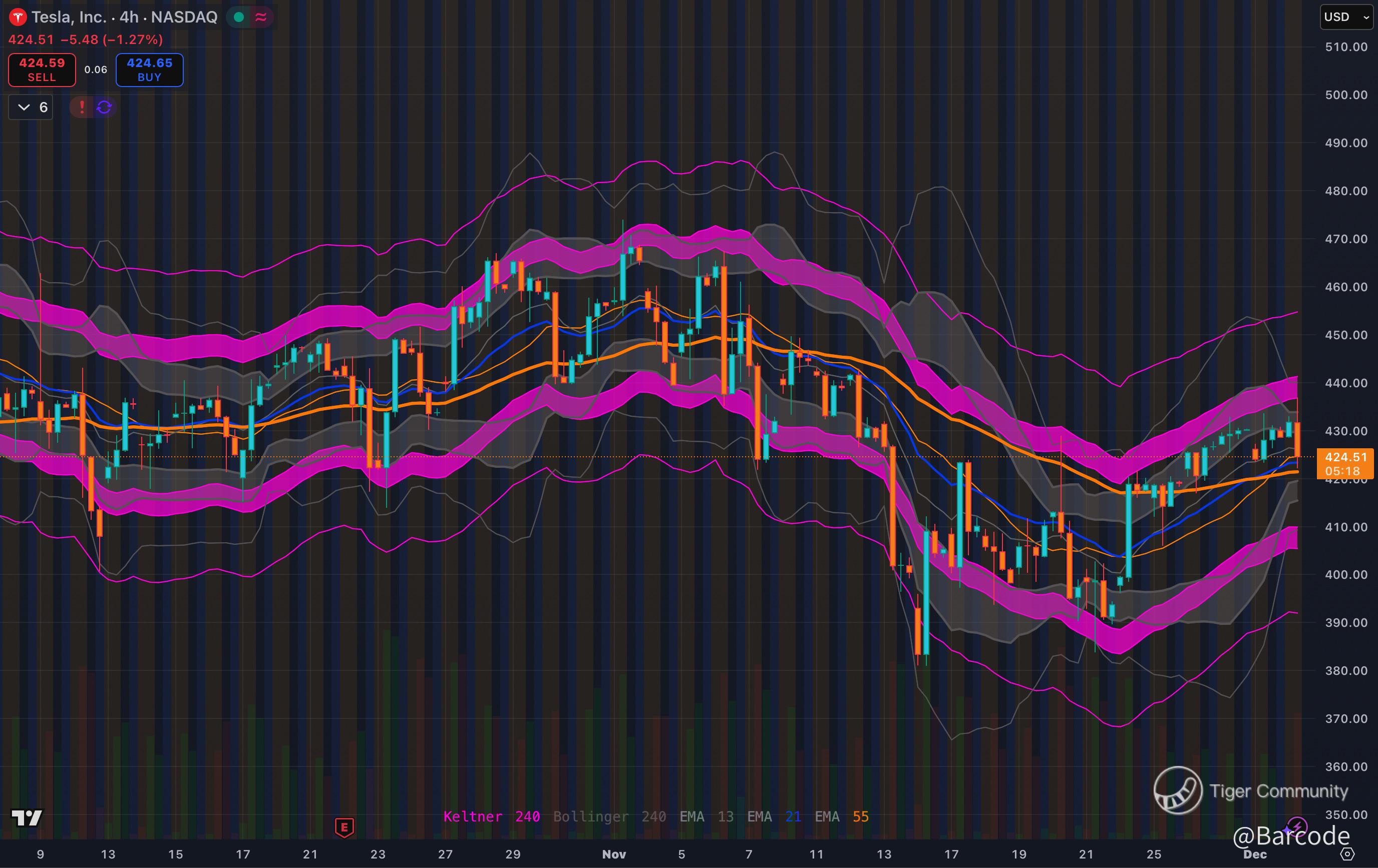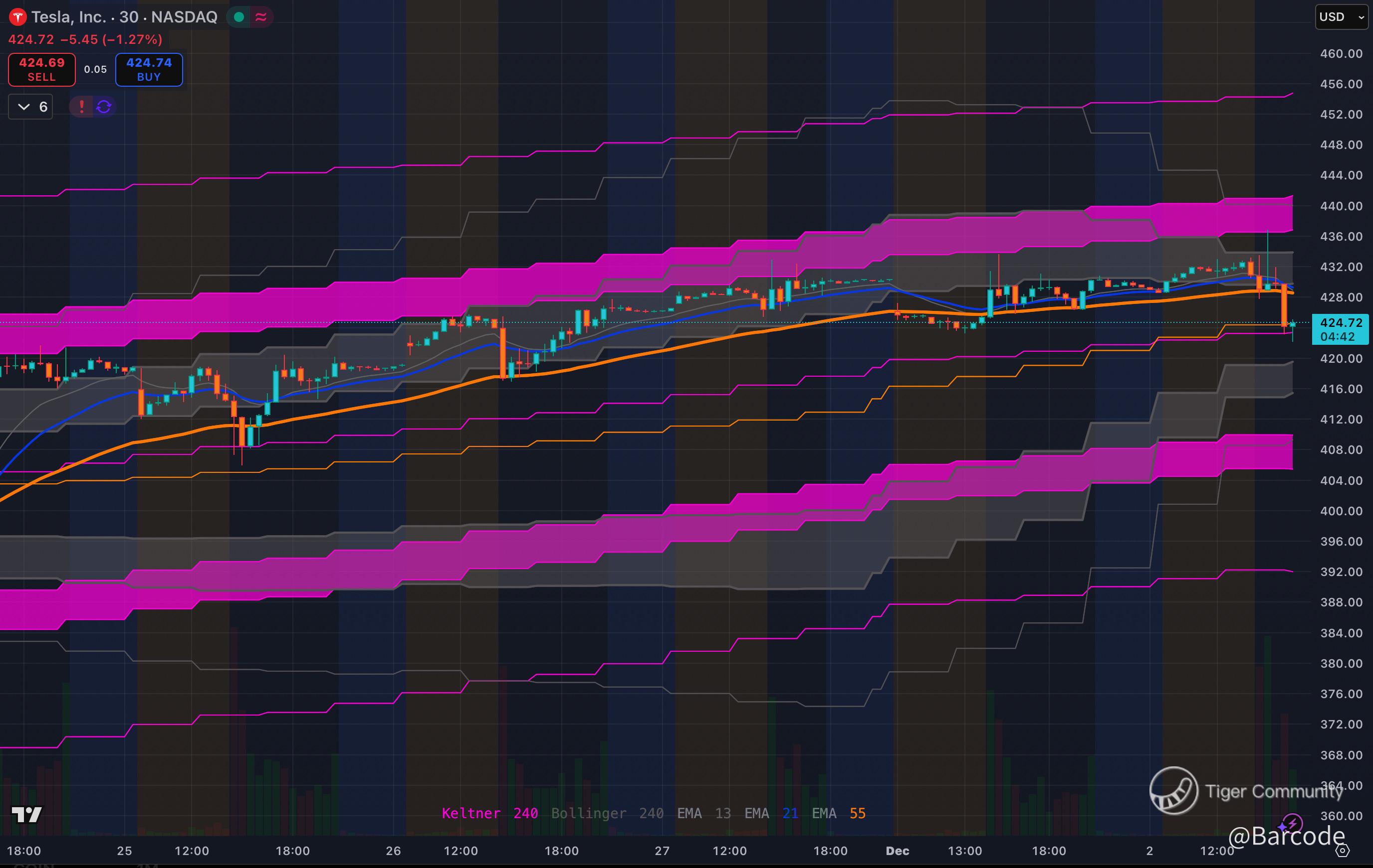 I am coming into today with $TSLA fading off a new high of the week at $433.50, almost perfectly matching Mondayโs pre market high at $433.66. Price has slipped back toward the HVL and HVL OTE band, which is the current battle zone. The 15 minute chart shows that spike into the $430 to $433 region being sold into, and the 30 minute and 4H views confirm that we are still oscillating inside the same six session liquidity corridor.