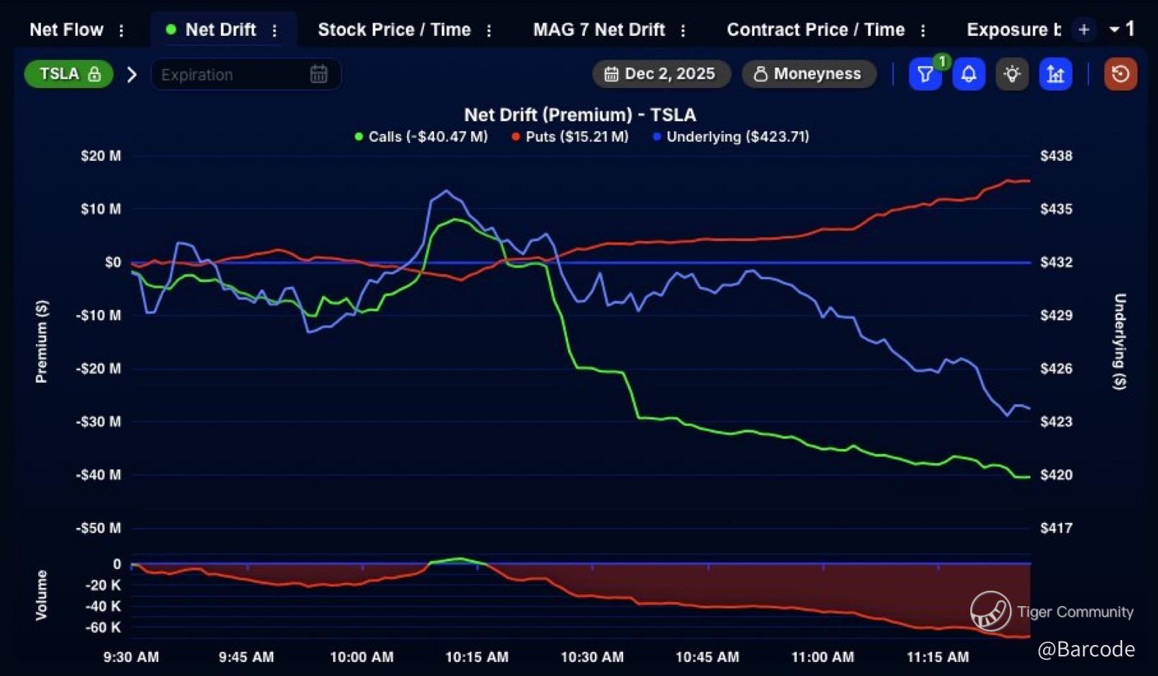 From the options lens, open interest remains tight at roughly 3.96M calls versus 3.43M puts with positive GEX, although that positive GEX is evolving as calls are unwound. More than $40M in single leg calls have been sold today and price is now down over $6, about 1.5% intraday. The net drift chart shows call premium bleeding lower while put premium grinds higher, with the underlying sliding from around $432 to the low $420s. That is a controlled downside skew, not a panic flush.