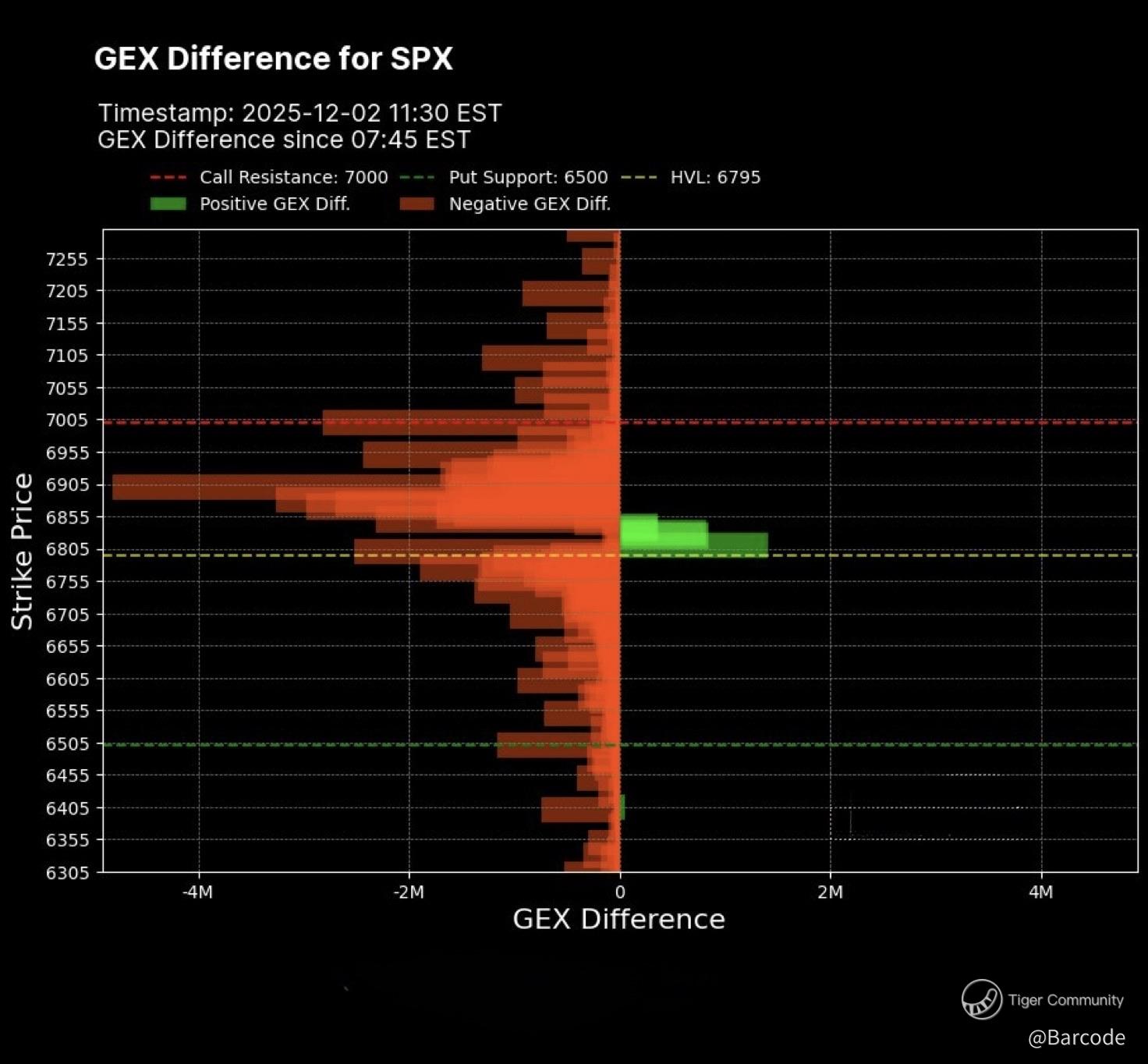 The SPX GEX map shows dominant negative GEX across most strikes although a pocket of positive exposure appears around 6825 with constructive flow measuring about +32745 GEX. Call walls sit at 7000 and put floors at 6500 with HVL at 6795 which explains the gravitational pull around that region. Positive GEX here should help reduce intraday volatility as hedging flows rebalance.