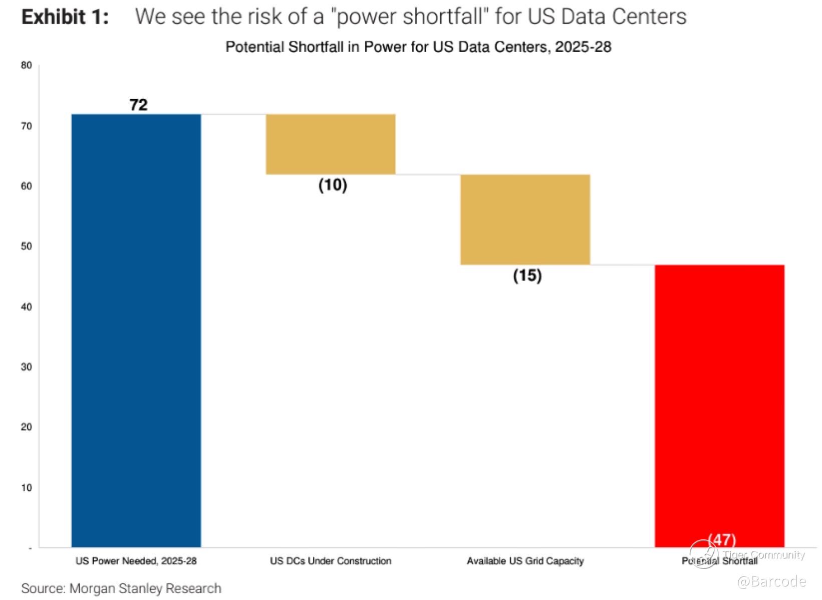 I’m leaning into Morgan Stanley’s updated framework for US data center power. Their model shows total demand at 72 GW over 2025 to 2028. Only 10 GW is covered by facilities under construction and roughly 15 GW from spare grid capacity which leaves a potential 47 GW shortfall.