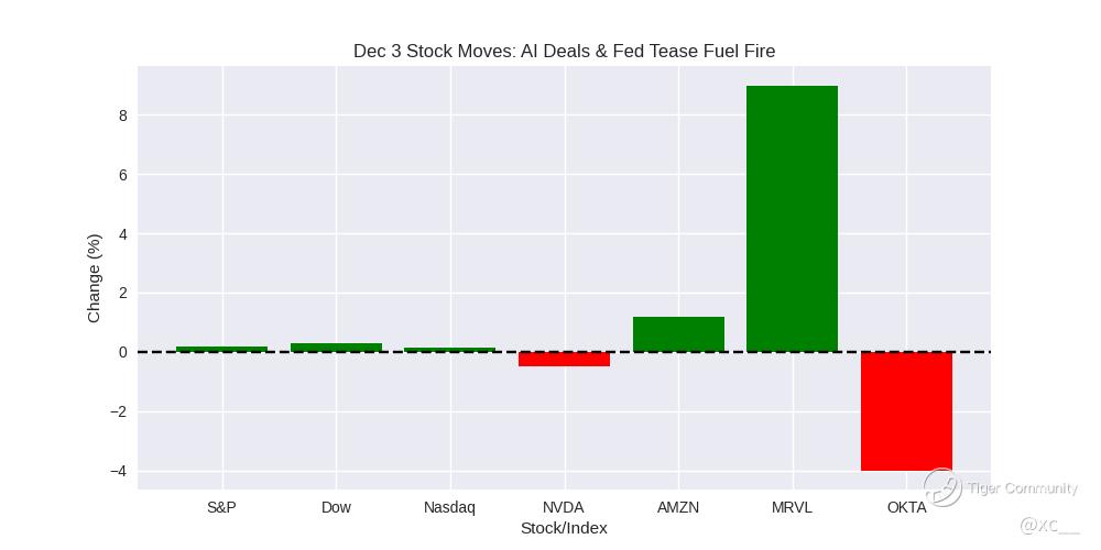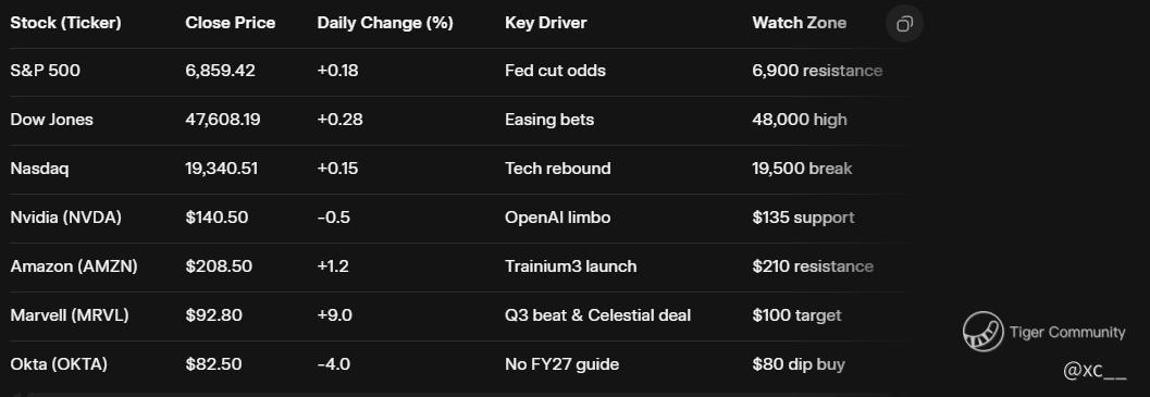 $NVIDIA(NVDA)$ $Amazon.com(AMZN)$ $Alphabet(GOOG)$ $Marvell Technology(MRVL)$ $Okta Inc.(OKTA)$ Wall Street's firing on all cylinders as U.S. stocks notched their sixth gain in seven sessions, with S&P 500 climbing 0.18% to 6,859.42, Dow up 0.28% to 47,608.19, and Nasdaq edging 0.15% to 19,340.51 amid easing bets hitting 87% and QT's liquidity flood unleashing trillions. Trump's "early next year" Fed chair tease praising Hassett sent prediction odds soaring to 55% on Kalshi, hinting dovish fireworks that could slash rates 100bps+ in 2026. Nvidia's CFO dropped a bombshell – that $100B OpenAI deal's still in limbo, not baked into $500B bookings – while Amazon unleashed Trainium3, a 4x faster AI chip undercutting Nvidia/Google on costs by 50%. Marvell exploded 9% on Q3 beats ($2.07B rev up 37%) and a $3.25B Celestial AI grab for optical interconnects, but Okta tumbled 4% after declining FY guidance despite Q3 smashes ($742M rev up 12%). These moves scream AI infra wars heating up – let's dissect the blaze, spotlight stocks, and map trades to dominate this December dash. πŸ’₯πŸ“ˆ