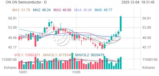 ON closed at $57.15 on December 4th, 2025 (ET), surging +11.01% (+$5.67) with impressive volume of 13.59M shares.