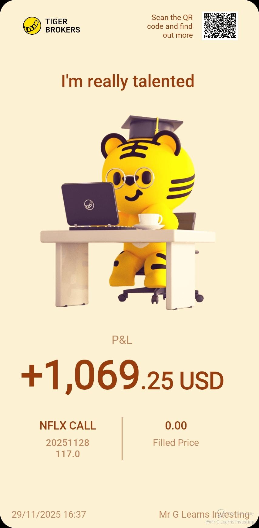 @Mr G Learns Investing timed this perfectly,wrapping up the NFLX CALL trade right before the stock split locked in a 1,069.25 USD profit. Nailing this opportunity amid Netflix’s recent volatility shows sharp control of trade timing — major props for this “great pre-split trade”! View More>>