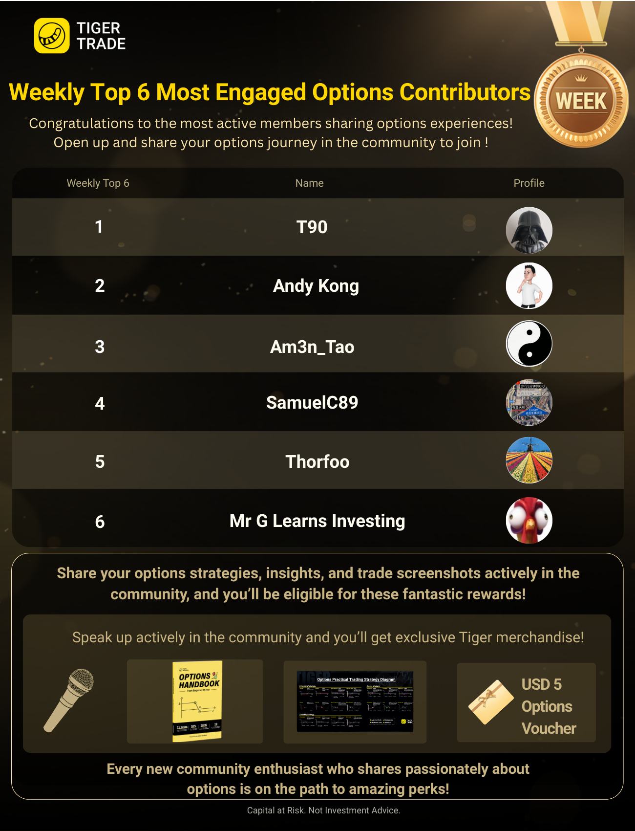 Let’s give a big round of applause to our winners! @T90, @Am3n_Tao and @Mr G Learns Investing have each earned an options mouse pad. @Andy Kong and @SamuelC89 both take home an options handbook, and @Thorfoo wins a USD 5 options voucher. Keep sharing your options insights to join this winning circle!