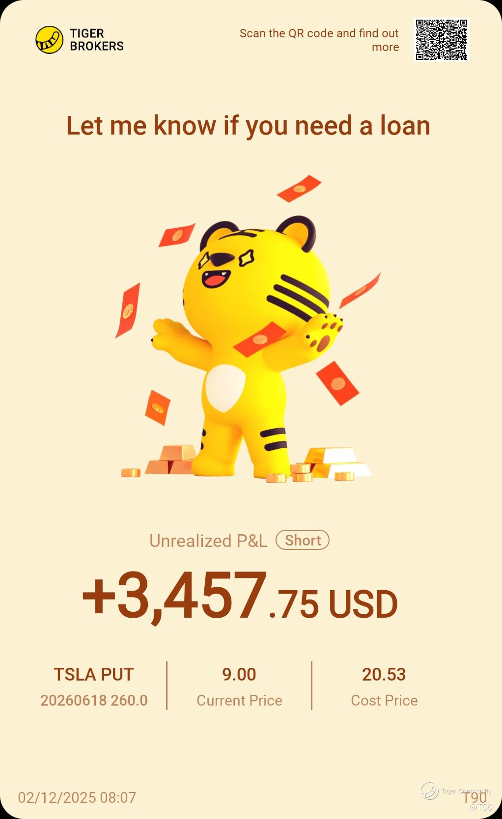 @T90 crushed this TSLA PUT trade, bagging an unrealized 3,457.75 USD profit that’s chef’s kiss for timing! With Tesla caught in the crossfire of policy buzz and bearish calls this week, nailing this put position shows sharp intuition for the stock’s volatility. Turning the market’s Tesla drama into cold hard gains? Total pro move amid the back-and-forth — major props for this calculated win! View More>>