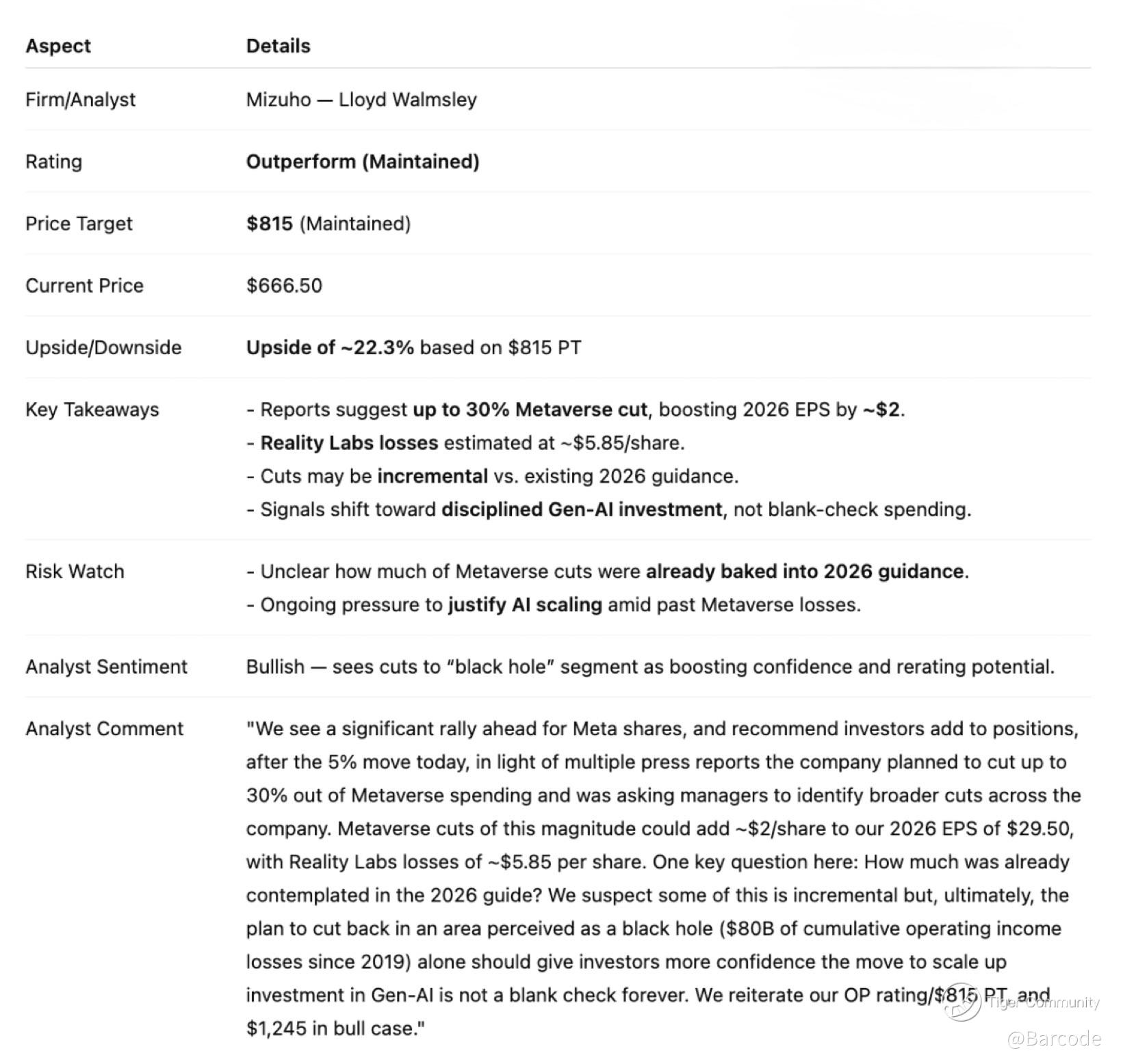 Mizuho reiterates Outperform with an $815 PT and ~22.3% upside. Cuts could add roughly $2 to 2026 EPS. Reality Labs losses pegged at ~$5.85 per share per year, no longer tolerated. Analysts now see disciplined Gen AI investment and confidence returning as the drag is removed. This is rerating fuel.
