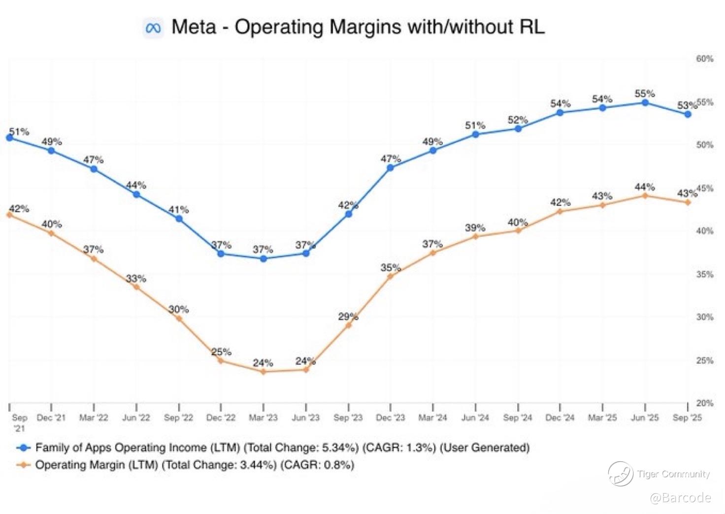 Ad revenue $51.24B Q3 up 26% YoY. Q4 guide $56 to $59B. 2025 capex rising to $70 to $72B. 2026 potentially $110B to fund rapid GPU expansion. 1M+ GPUs incoming across Prometheus 1GW Ohio and Hyperion 5GW Louisiana superclusters. Threads MAUs at 350M. Llama pushing AI across 4B users. Compute is the moat.