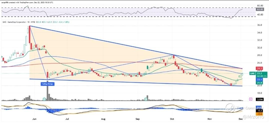 -- Purchase one GME call at a $24.50 strike price -- the falling wedge's upper trendline -- and a Dec. 12 expiration (i.e., after Tuesday's earnings). This would cost about $0.70 at recent prices.