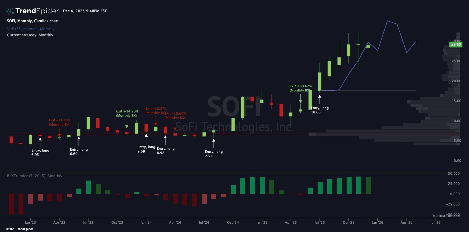 For me that makes $SOFI a hold, not a buy – bullish signs are there, but R:R isn’t good enough to start a new long here.