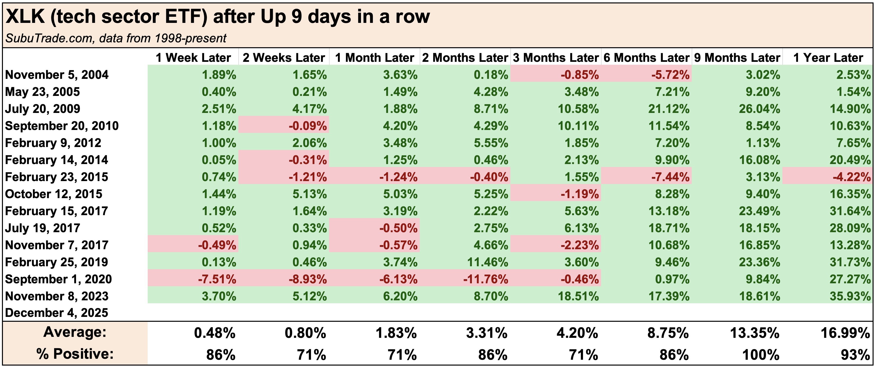 Here is what historically has happened to Tech Stocks after 9 straight green days