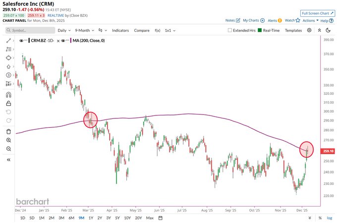 Salesforce $CRM closed above the 200-day moving average last week for the first time in more than 9 months 🚨📈 What a reversal!!