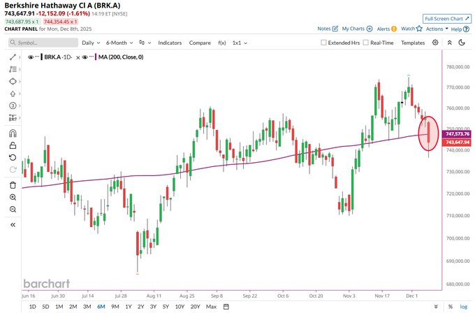 Berkshire Hathaway $BRK.A on track to close below its 200-day moving average 📉📉