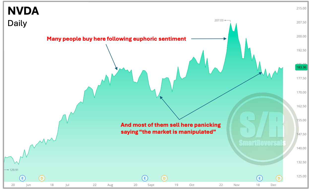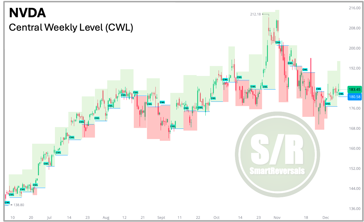 Let’s continue with the NVDA case study, the Central Monthly Level (CML) that has been posted for the month ahead (for example, the CML for December was posted at the end of November), see how relevant the line is.