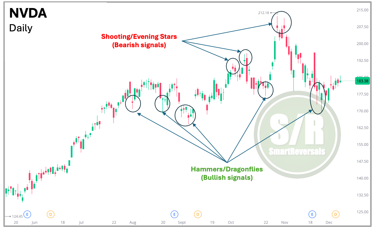 To get a better sense of market sentiment and potential reversals, traders must switch to candlestick charts. Unlike a simple line, candlesticks tell a detailed story of the battle between buyers and sellers during each time period. As shown in the chart below, specific formations like “Shooting Stars” (bearish signals) and “Hammers” (bullish signals) can anticipate intra-day reversals long before they become obvious trends. Recognizing these patterns allows you to spot exhaustion in a rally or strength in a sell-off.