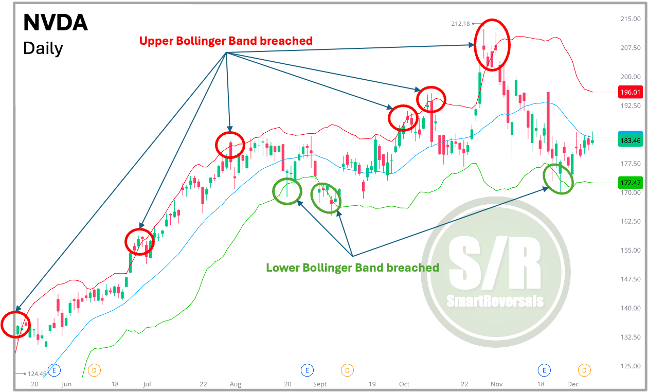 To further refine your view, Bollinger Bands are essential for measuring volatility and identifying extremes. As seen in the fourth chart below, price action tends to stay within these bands. When the price breaches the Upper Bollinger Band, it often signals that the asset is overextended or “expensive” relative to recent volatility. Conversely, a tag or breach of the Lower Bollinger Band can indicate the asset is “cheap” or oversold. This tool is invaluable for spotting mean reversion opportunities where the price snaps back to equilibrium.