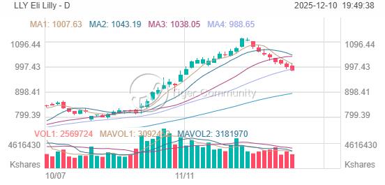 LLY closed at $982.22 on December 10, down -1.54% (-$15.37) from previous close of $997.59. Stock trading 11.7% below 52-week high of $1111.99, with intraday range of $979.18-$1012.00.