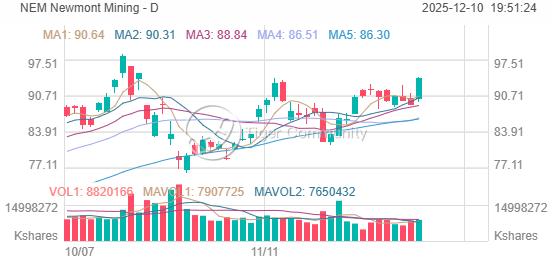 NEM closed at $94.09 (EST Dec 10), up +5.72% (+$5.09), trading within 4.5% of its 52-week high of $98.58.