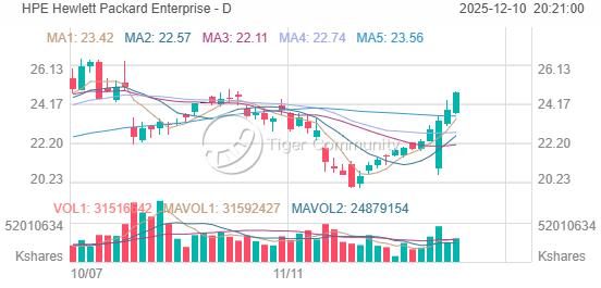 HPE closed at $24.77 on December 10th, up +3.81% ($0.91), trading within a 4.78% intraday range ($23.67-$24.81).