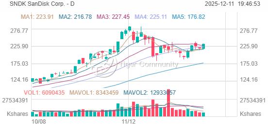 SNDK closed at $232.86 on December 11th, up +6.11% (+$13.40), trading 18.2% below its 52-week high of $284.76. After-hours trading shows continued strength at $226.91.