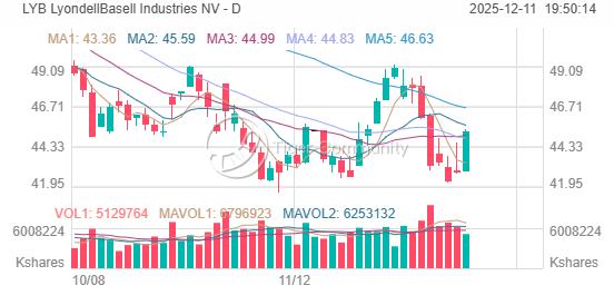 LYB closed at $45.23 on Dec 11, surging +5.73% (+$2.45) from yesterday's $42.78.
