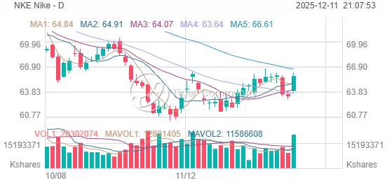 Nike closed at $65.79 (EST 2025-12-11), up +3.88% (+$2.46), marking a decisive break from recent consolidation.