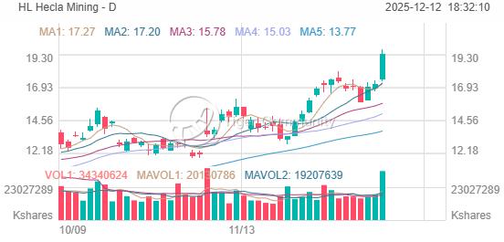 HL closed at $19.35 on December 12, surging +12.57% ($2.16) from yesterday's $17.19. The stock hit a new 52-week high of $19.68, representing a massive +334% gain from its 52-week low of $4.46.