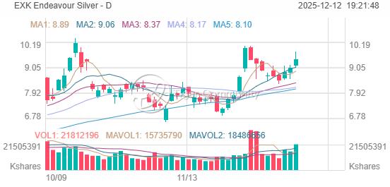 EXK closed at $9.41 on December 12, 2025 (EST), up +4.21% (+$0.38) from previous session.