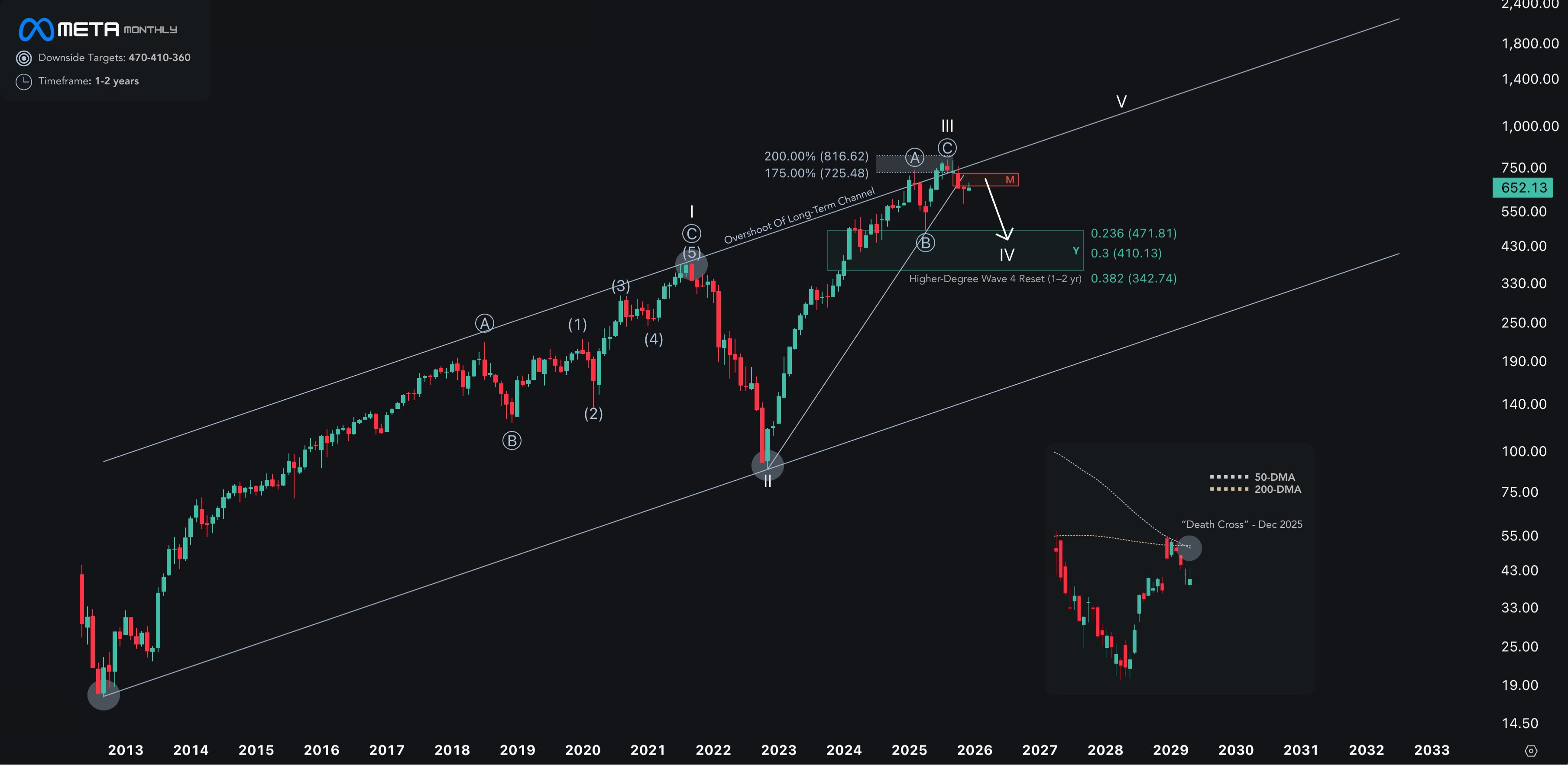 $Meta Platforms, Inc.(META)$ has structurally weakened following a rejection at monthly FVG resistance and the confirmation of a bearish Death Cross.