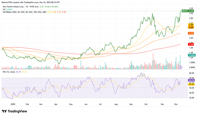 Over the past month, silver prices have surged nearly 25%, pulling the 20-day average higher. NEWP has since reclaimed its 50-day moving average, confirming a renewed short-term uptrend that builds on the earlier breakout above the 200-day moving average.