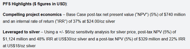 The Silver Sand project’s 13-year mine life produces an estimated average annual metal production of over 12 million ounces of silver in a high-margin operating scenario at an average LOM all-in sustaining cost ("AISC") of $10.69/oz silver. Regarding the economics of this project, this is what New Pacific Metals illustrates on its website: