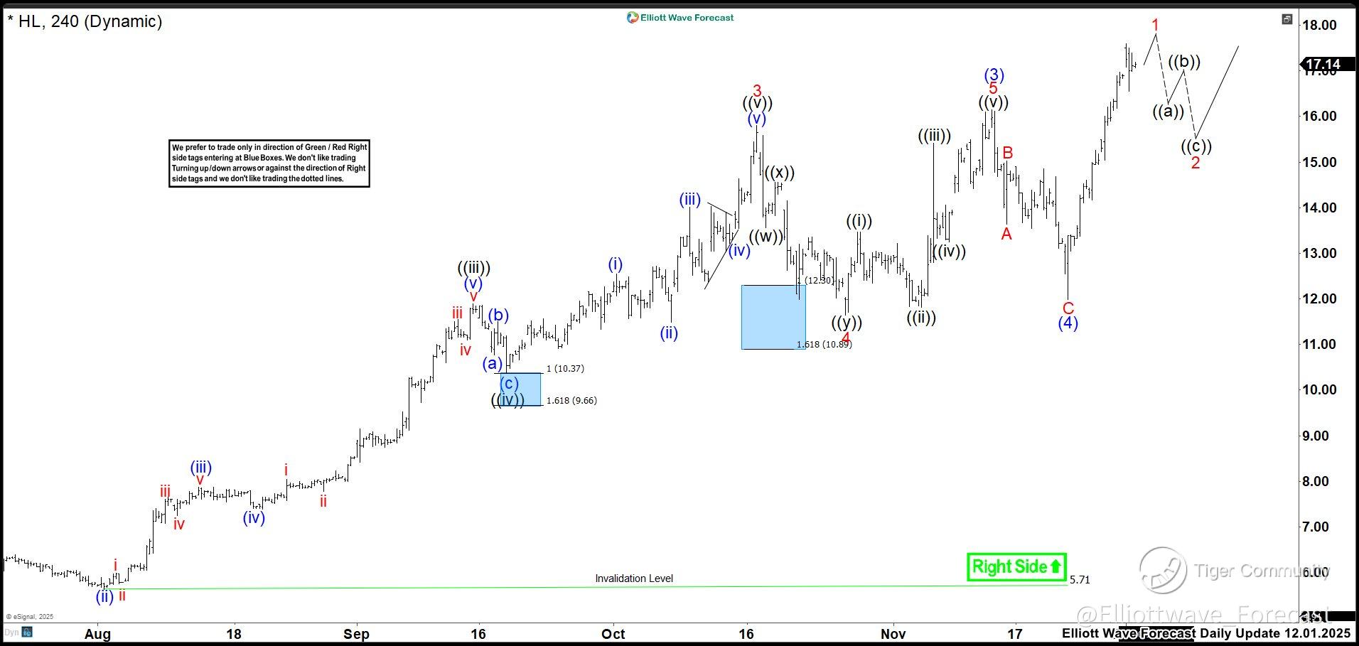Then, in October, HL showed a strong rally and extended higher. Therefore, we adjusted the count and labeled it as wave ((v)) of 3, which ended above 15 dollars. After that, another correction appeared, and we looked to continue the bullish trend. As a result, we called for buying opportunities in the zone of 12.30–10.89 to complete wave 4 and move upward as wave 5, aiming to break the high of wave 3.