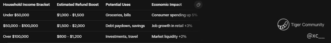 But let's break down the numbers to see why this is massive. Tariff collections have exploded, hitting levels that make previous years look tiny, allowing for this unprecedented giveaway. Households earning under $100,000 stand to gain the most, with estimates showing average boosts that could cover a month's rent or a family vacation. Small businesses aren't left out either β lower effective taxes mean more reinvestment, potentially adding thousands of jobs in manufacturing hubs. π The ripple effect? Consumer confidence soars, stock markets stabilize on spending surges, and even crypto gets a lift from looser financial pressures.