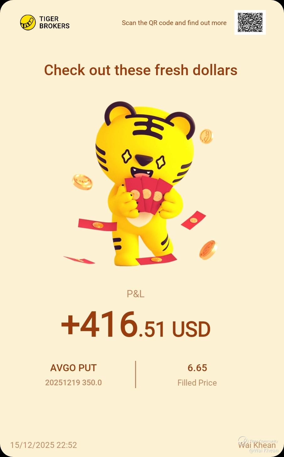 @Wai Khean’s AVGO PUT trade shows serious market intuition! Amid cautious sector sentiment and Broadcom’s massive market cap drop, he locked in 416.51 USD in profit by using the low-cost power of options to capitalize on short-term market swings. Great call on this sharp play! View More>>