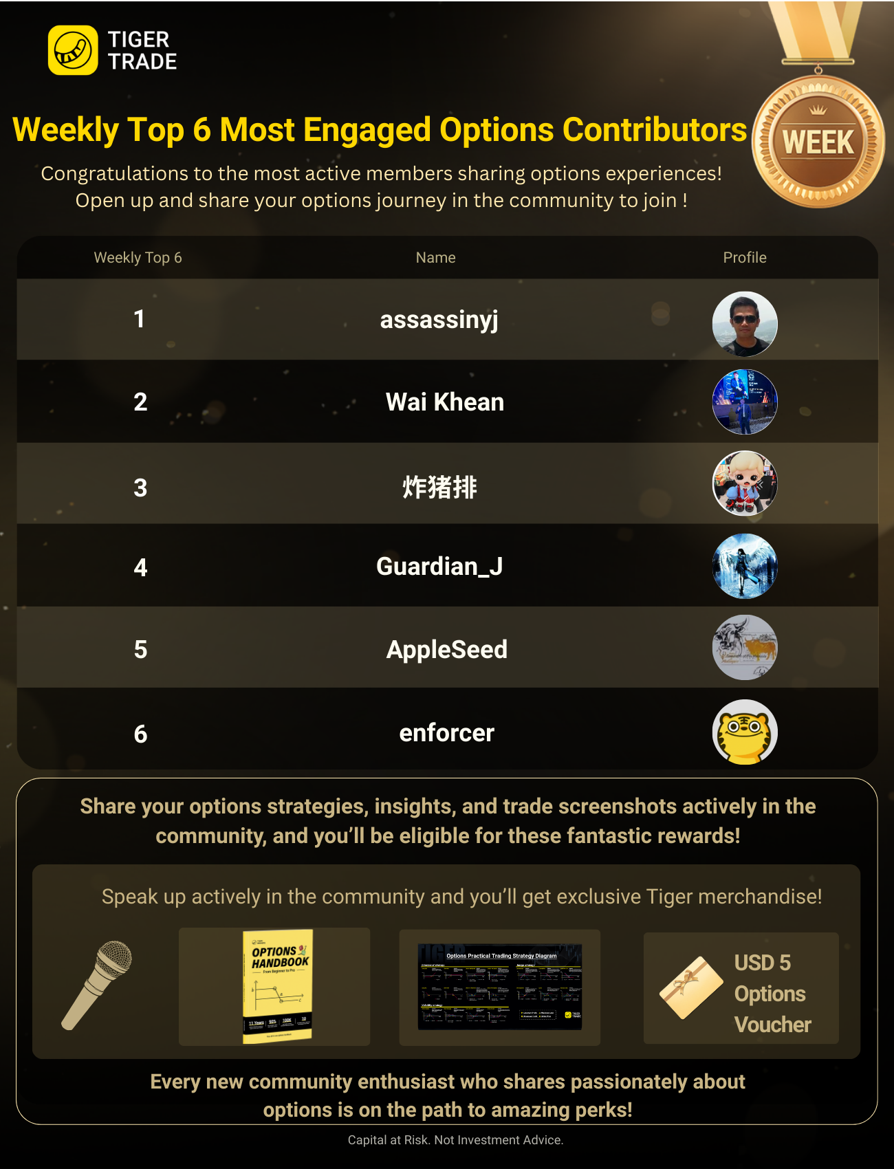 Let’s give a big round of applause to our winners! @assassinyj, @Wai Khean, @enforcer and @炸猪排 have each earned an options mouse pad. @Guardian_J takes home an options handbook, and @AppleSeed wins a USD 5 options voucher. Keep sharing your options insights to join this winning circle!