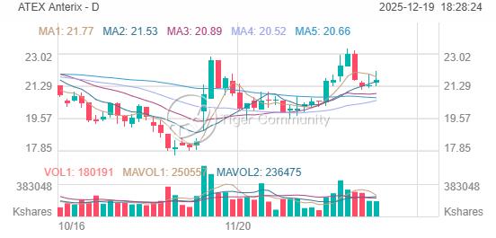 ATEX closed at $21.63 (EST Dec 19), gaining +1.36% (+$0.29) with trading volume of 180.2K shares.