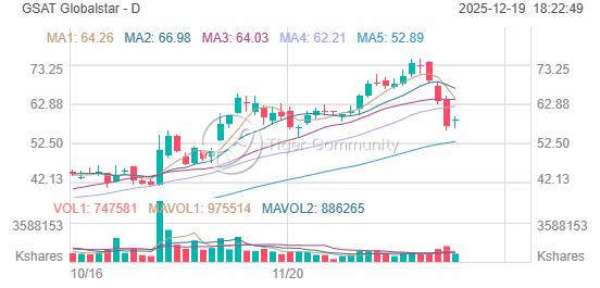 GSAT closed at $58.64 on December 19, 2025 EST, up +3.04% (+$1.73) with after-hours trading extending gains to $59.75.