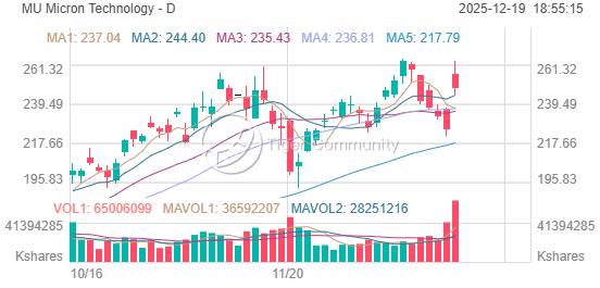 MU closed at $248.55 on December 19, 2025, surging +10.21% (+$23.03) with massive volume of 65.01M shares.
