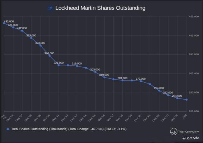 Lockheed Martin has reduced shares outstanding by roughly 46.76% since 2005, a -3.1% CAGR. That discipline supported EPS. At this stage of the cycle, reinvestment into capacity and delivery cadence carries greater long-term value.