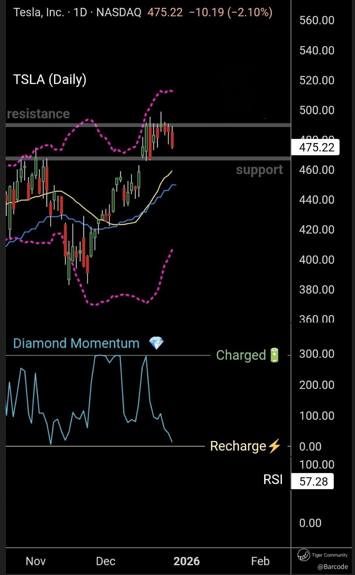 From the daily chart, Tesla is $475.22, down -2.10% on the session shown. RSI sits at 57.28, constructive but cooling. Repeated resistance tests were followed by a weak close on Friday. Structure now favours a re-test of support. Caution is warranted, not panic.