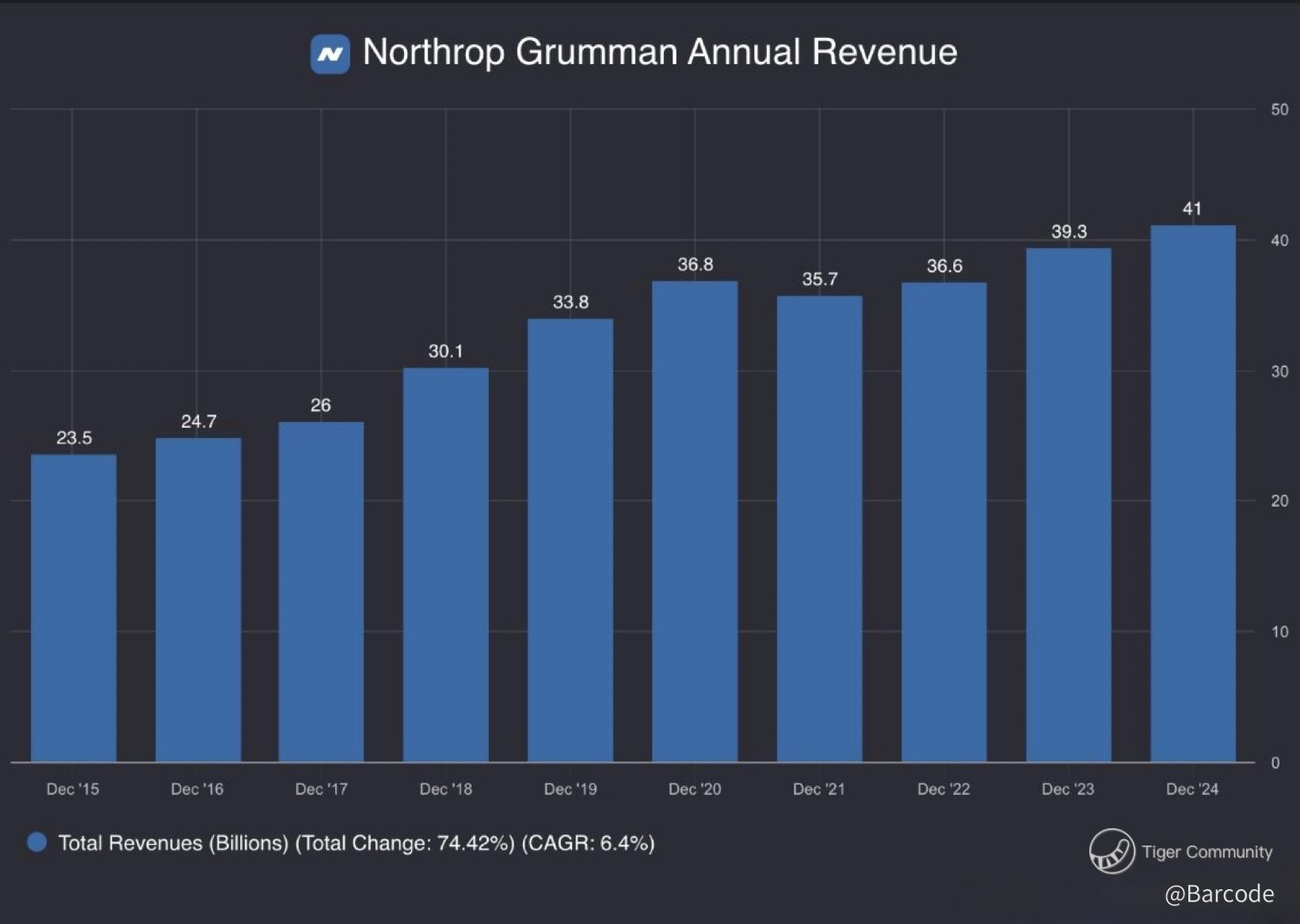 Northrop Grumman’s revenue growth from $23.5B in 2015 to $41B in 2024 reflects program density. Hypersonic missile-warning satellites embed the company into sovereign infrastructure.