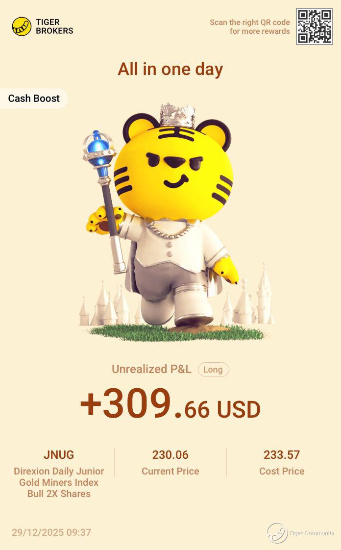 $Direxion Daily Junior Gold Miners Index Bull 2X Shares(JNUG)$ is on fire! 4.69% single-day gain on Dec 26 plus 37.27% surge in a month, 2x leverage amplifies profits – gold boom pays off big!