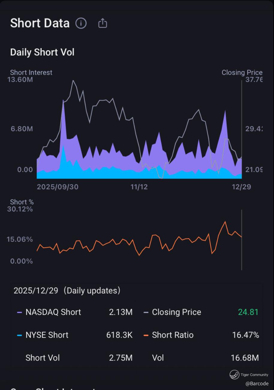 Iโm dealing with a stock trading around $24.8 while absorbing 2.75M shares of daily short volume against 16.68M shares traded. Roughly 16.47% of that sessionโs volume was sold short, with activity concentrated through NASDAQ. That reflects active conviction, not passive hedging.