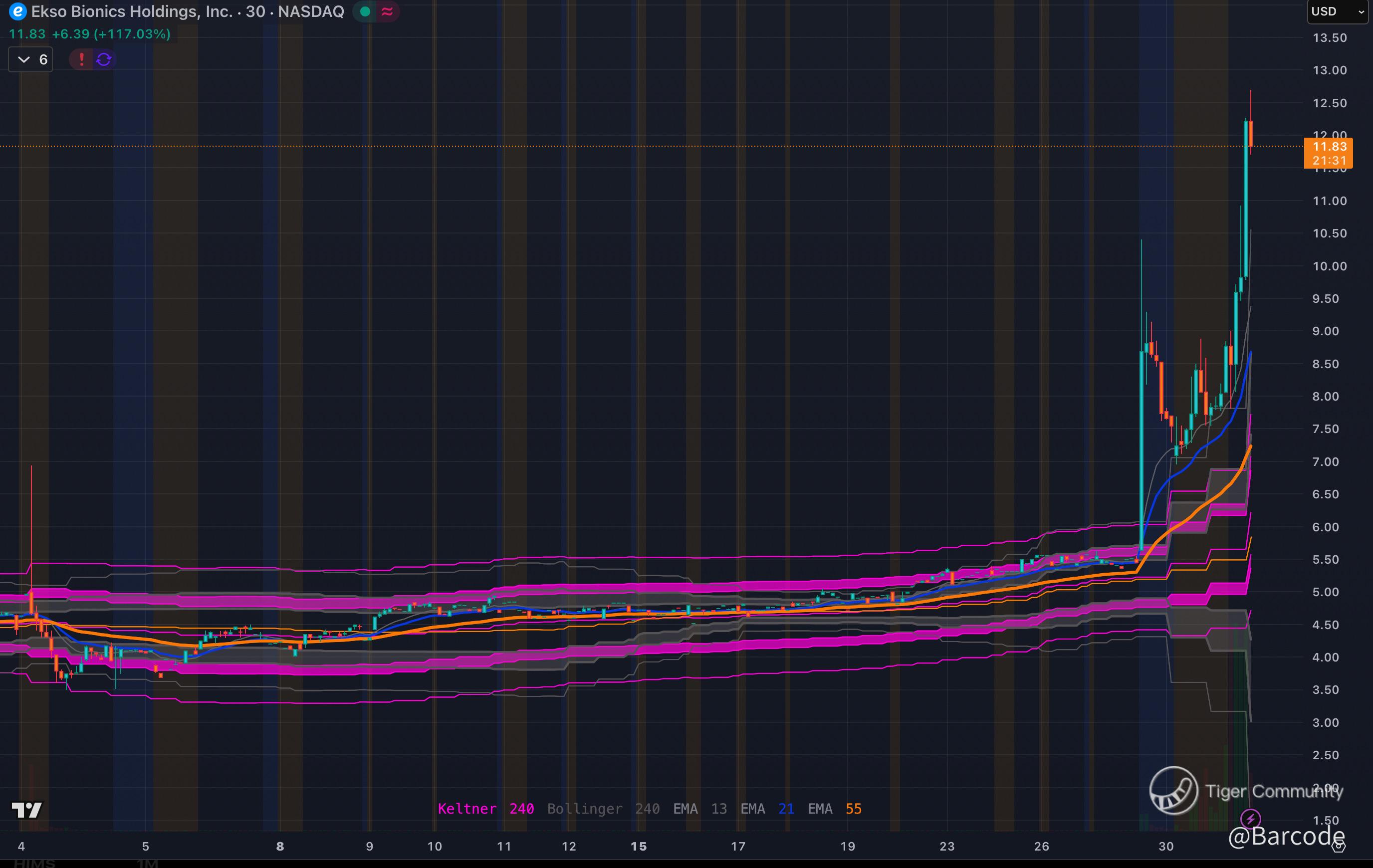 I reviewed the $EKSO charts across the 30-minute, 4-hour, daily, and long-term timeframes to understand how the market initially processed the ChronoScale announcement, and the signal is consistent across scales.