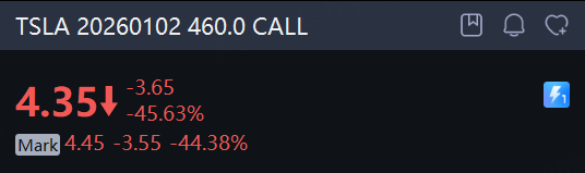 There are 1.75 million Tesla option contracts traded on Tuesday, down 2% from the previous trading day. Call options account for 59% of overall option trades. Particularly high volume was seen for the $460 strike call option expiring January 2, 2026, with 84,393 contracts trading. TSLA 20260102 460.0 CALL